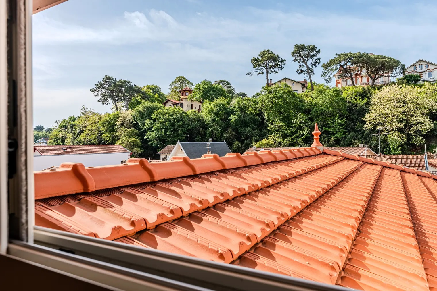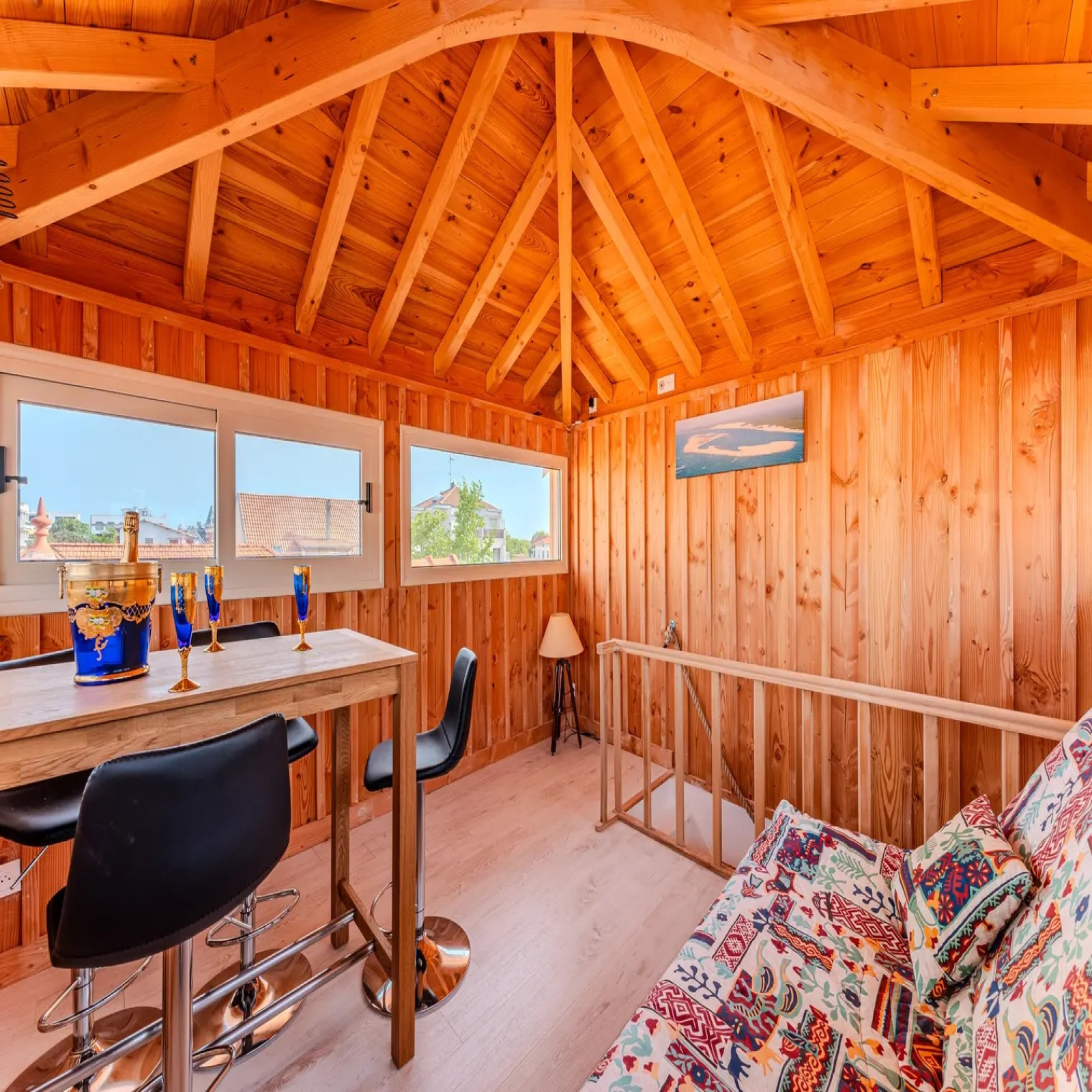 À l’étage supérieur, nichée au niveau du toit, une pièce unique de réception, lecture ou détente offre une vue panoramique à 360° sur le Bassin et la ville, un espace rare et privilégié.
