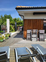 La maison est construite selon les normes RT2012 et PMR et bénéficie encore des garanties décennales. Le chauffage est par le sol par PAC avec climatisation réversible avec un DPE A, donc très economique. La maison est également équipée de volets roulants electriques et il y a un store banne en plus pour la terrasse sud. Le jardin et terrasses ont été conçus pour être très faciles à entretenir avec arrosage automatique. Le terrain, fermé par un portail éléctrique, comprend également un abri-jardin et du parking pour 2/3 voitures.