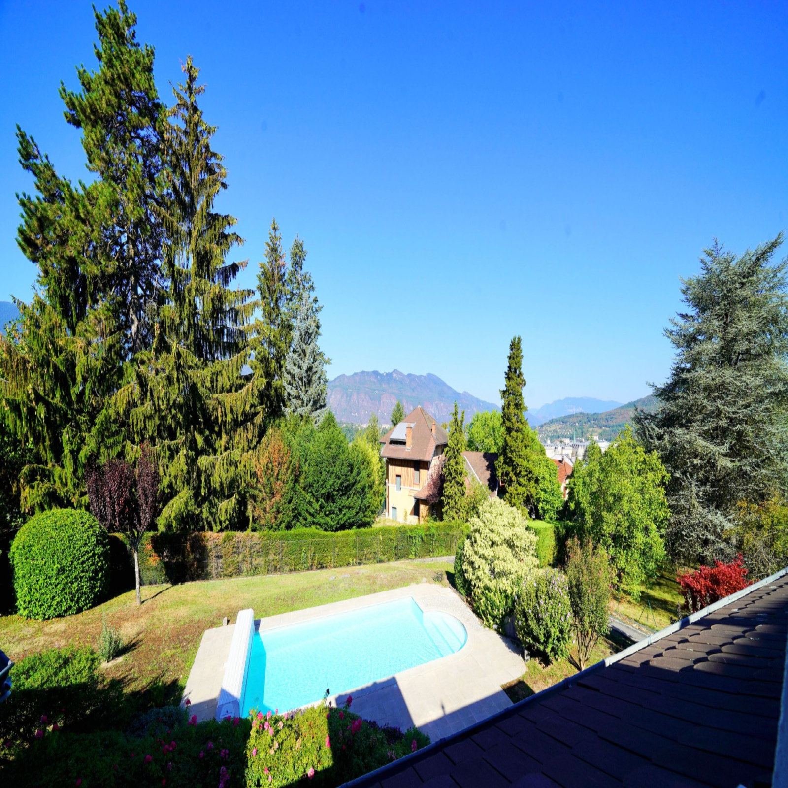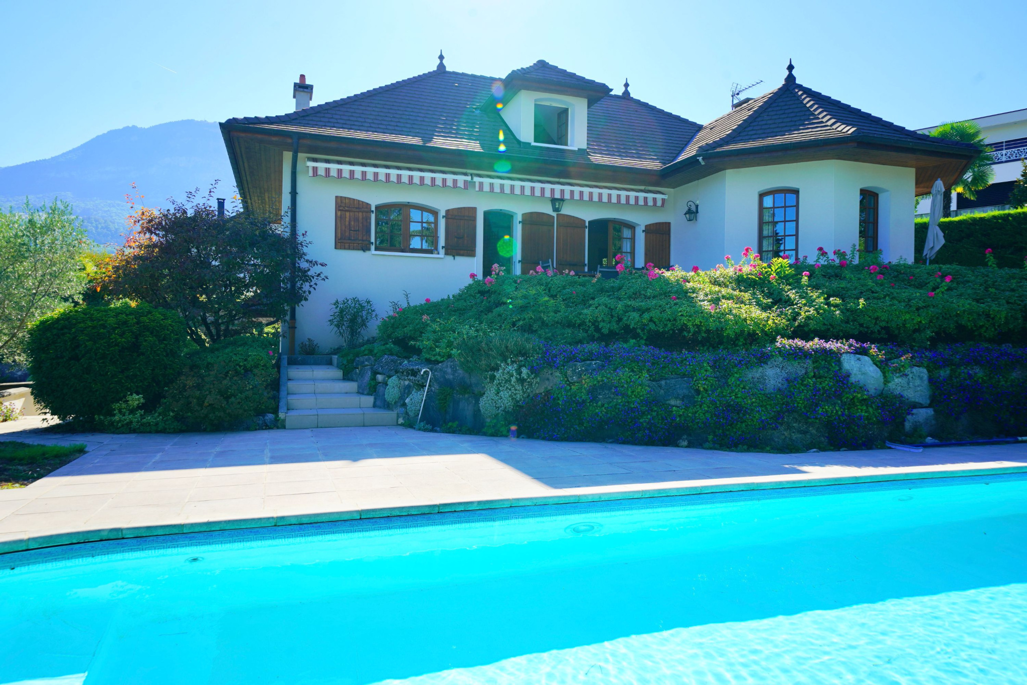 AIX-LES-BAINS - Située dans le quartier résidentiel de Saint Pôl, en bordure du Bois Vidal, Cette propriété de charme bénéficie d'une situation privilégiée, à 10 minutes à pied des anciens Thermes, au calme et à seulement 7 minutes à pied du centre ville. Une maison cossue offrant une configuration fonctionnelle composée de 3 grandes chambres, dont une suite parentale en rez-de-chaussée, un bureau et un bel espace de vie d'une surface de 60 M2 ouvert sur la terrasse et le jardin. Elle dispose d'un sous-sol complet composé d'un double garage, d'une cave, d'une buanderie, d'un local technique pour la piscine et d'un vaste espace de rangement. Cette villa est équipée d'une climatisation. Elle bénéficie d'un ensoleillement optimum et d'une belle vue sur les montagnes. Son terrain de 1 526 M2 joliment paysagé, agrémenté d'une piscine, est entièrement clos . Une atmosphère de quiétude se dégage de ce lieu.