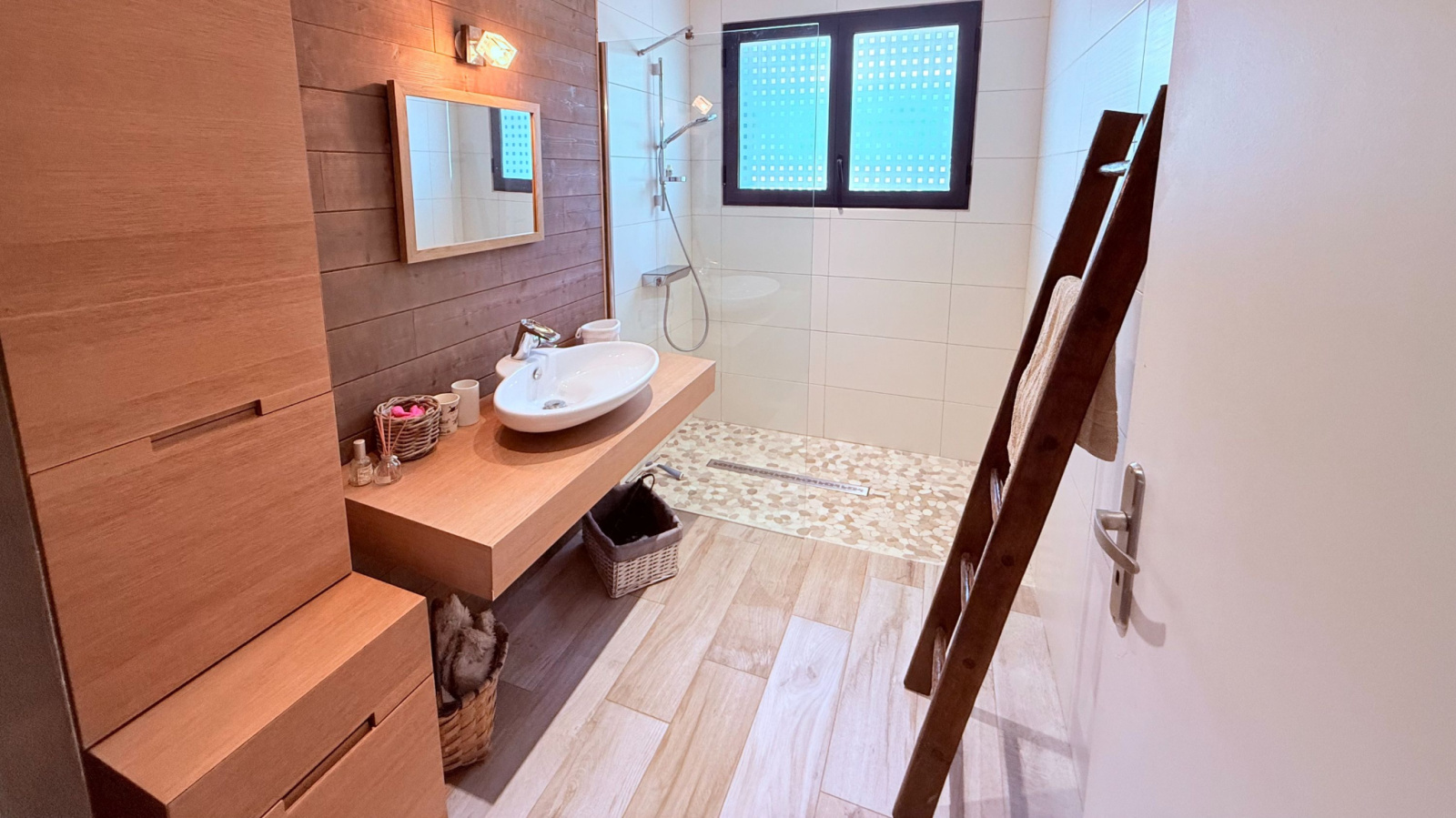 Au rez-de-chaussée : Un vaste séjour triple de 83 m², baigné de lumière, avec de grandes baies à galandage ouvrant sur plusieurs terrasses - Une suite parentale donnant directement sur la piscine et la terrasse, comprenant chambre, dressing et salle de bain - Deux chambres supplémentaires -Une salle d'eau et un WC indépendant complètent ce niveau. À l'étage : Un palier dessert deux chambres, dont une avec sa salle d'eau et WC privatifs.