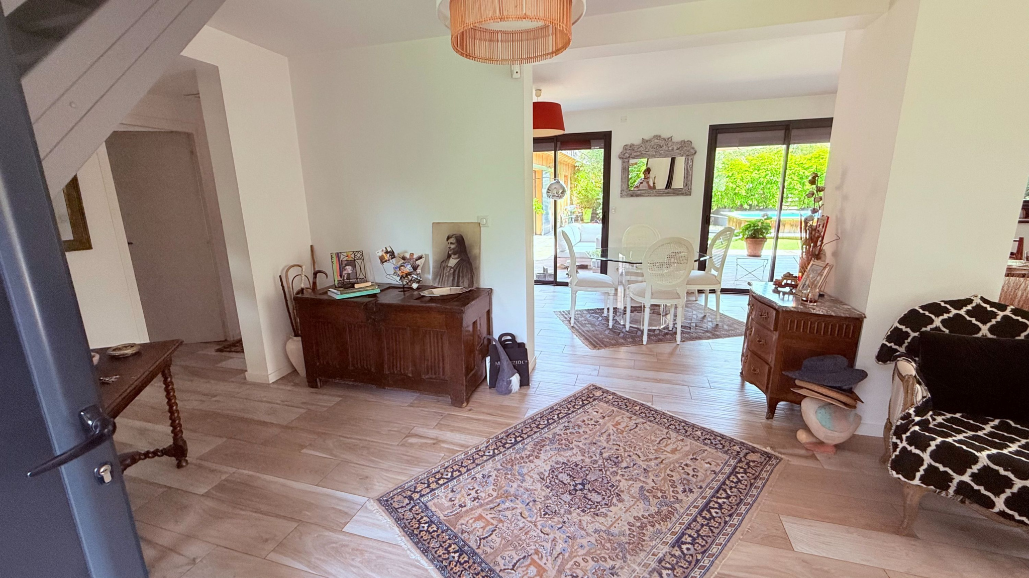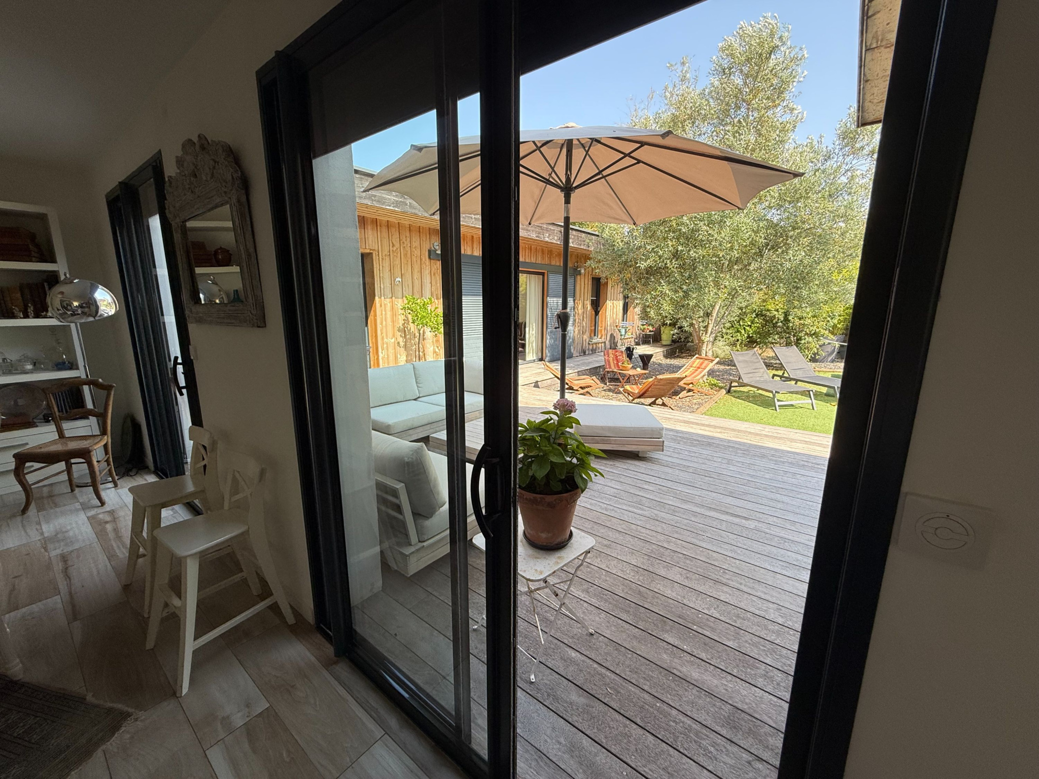À l'extérieur : Sur un terrain de 1 037 m² avec puits foré et arrosage automatique, profitez d'un jardin arboré et de multiples terrasses ensoleillées à différents moments de la journée. Prenez place autour d'une belle piscine où chacun peut trouver son coin de détente préféré. Un garage spacieux de 38 m² et un abri de jardin viennent compléter l'ensemble.